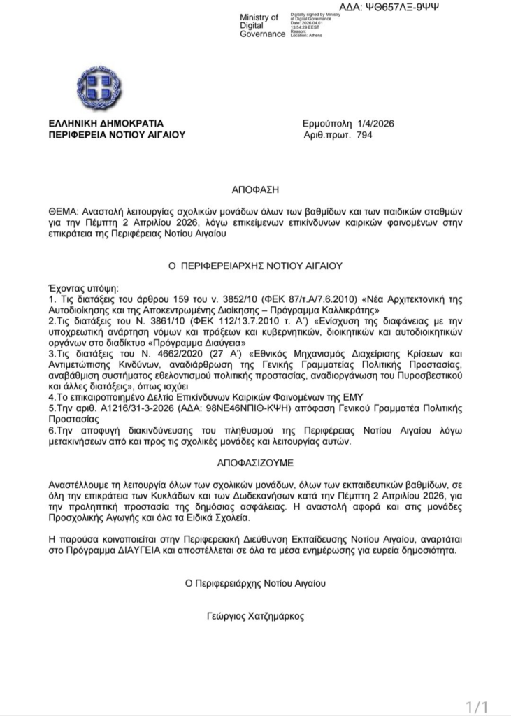 Με απόφαση του ο Περιφερειάρχης Νοτίου Αιγαίου, Γιώργος Χατζημάρκος κάνει γνωστό ότι και αύριο, Πέμπτη, 02 Απριλίου τα σχολεία του Νοτίου Αιγαίου θα παραμείνουν κλειστά.