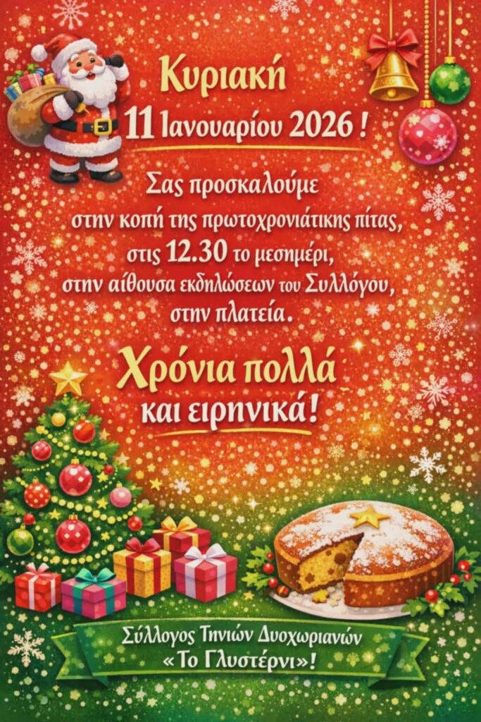 Την Κυριακή 11 Ιανουαρίου θα πραγματοποιηθεί η κοπή βασιλόπιτας, στην αίθουσα του συλλόγου στην πλατεία στις 12:30.