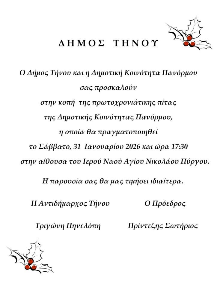 Ο Δήμος Τήνου και η Δημοτική Κοινότητα Πανόρμου σας προσκαλούν στην κοπή της πρωτοχρονιάτικης πίτας της Δημοτικής Κοινότητας Πανόρμου, η οποία θα πραγματοποιηθεί το Σάββατο, 31 Ιανουαρίου 2026 και ώρα 17:30 στην αίθουσα του Ιερού Ναού Αγίου Νικολάου Πύργου.