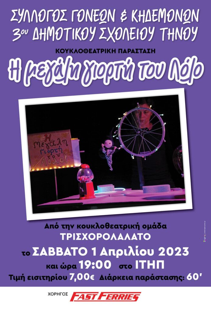 από την κουκλοθεατρική παράσταση τρισχορολαλατο το Σάββατο 1η Απριλίου και ώρα 19.00 στο Ίδρυμα Τηνιακού Πολιτισμού.