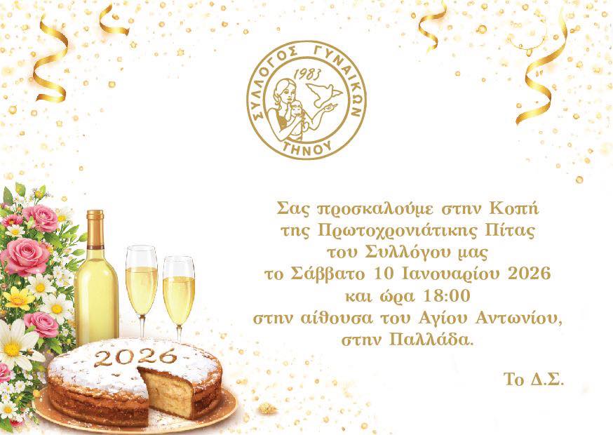 Σας προσκαλούμε στην κοπή της Πρωτοχρονιάτικης Πίτας του Συλλόγου Γυναικών Τήνου.