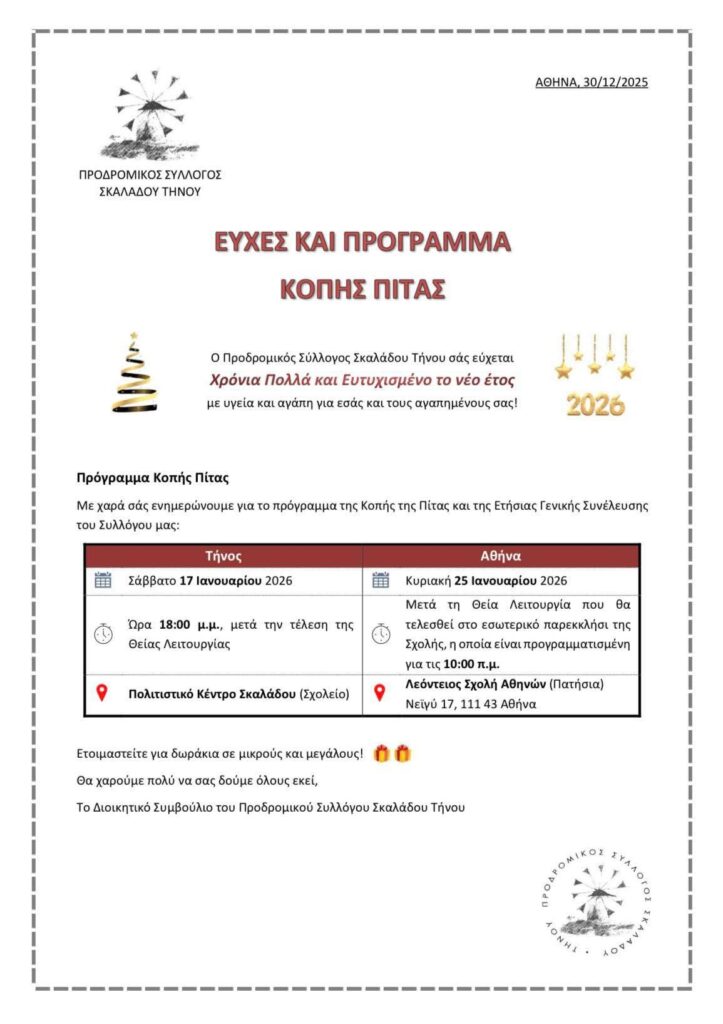 Τήνος: Το Σάββατο 17 Ιανουαρίου 2026 και ώρα 18:00 μ.μ. στο Πολιτιστικό Κέντρο Σκαλάδου (Σχολείο) μετά την τέλεση της Θείας Λειτουργίας