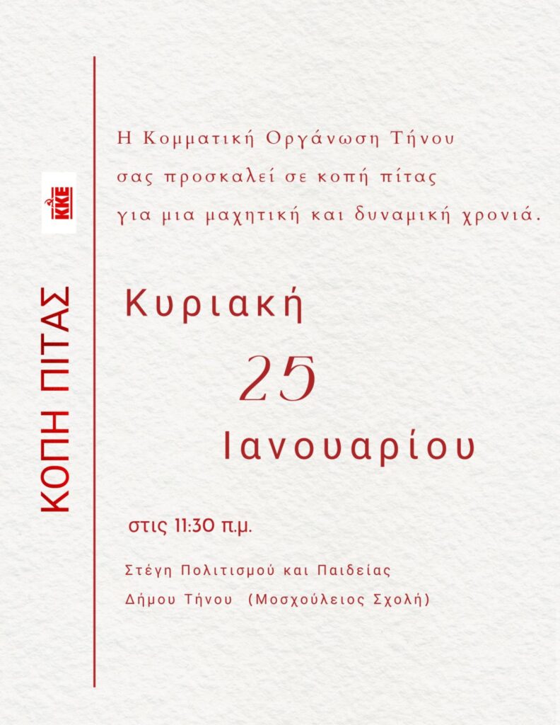 Με πολλή χαρά σας περιμένουμε στην εκδήλωση που ετοιμάζουμε την Κυριακή 25/1. Η εκδήλωση θα ανοίξει με ομιλία πάνω στις πιο σημαντικές πολιτικές εξελίξεις και με έμφαση στο πολεμικό σκηνικό που εξελίσσεται και γιγαντώνεται. Θα ακολουθήσει κοπή πίτας.