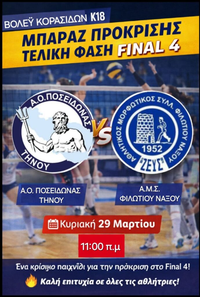 Η ομάδα του Α.Ο. Ποσειδώνα Τήνου αντιμετωπίζει την Α.Μ.Σ. Φιλωτίου Νάξου «ΖΕΥΣ» σε έναν κρίσιμο αγώνα για την Τελική Φάση (Final 4) του Πρωταθλήματος Κορασίδων Κ18.