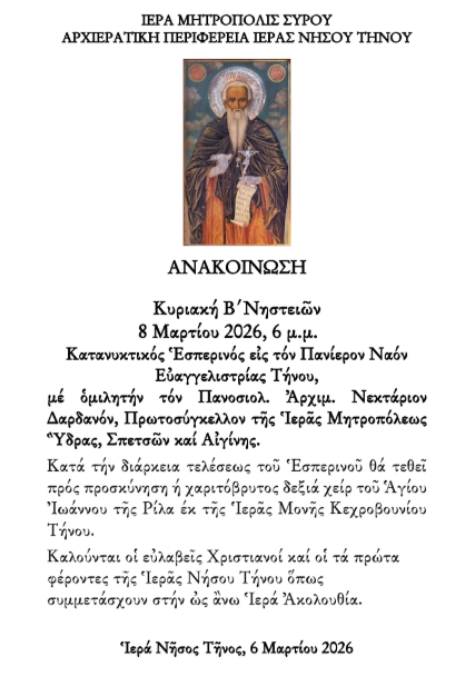 μέ ὁμιλητήν τόν Πανοσιολ. Ἀρχιμ. Νεκτάριον Δαρδανόν, Πρωτοσύγκελλον τῆς Ἱερᾶς Μητροπόλεως Ὓδρας, Σπετσῶν καί Αἰγίνης. Κατά τήν διάρκεια τελέσεως τοῦ Ἑσπερινοῦ θά τεθεῖ πρός προσκύνηση ή χαριτόβρυτος δεξιά χείρ τοῦ Ἁγίου Ἰωάννου τῆς Ρίλα έκ τῆς Ἱερᾶς Μονῆς Κεχροβουνίου Τήνου.
