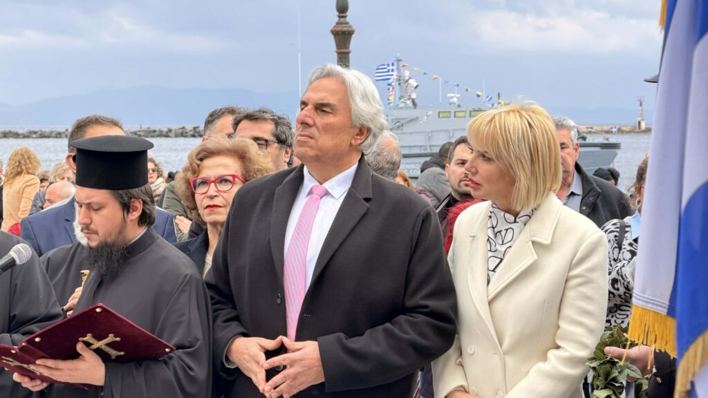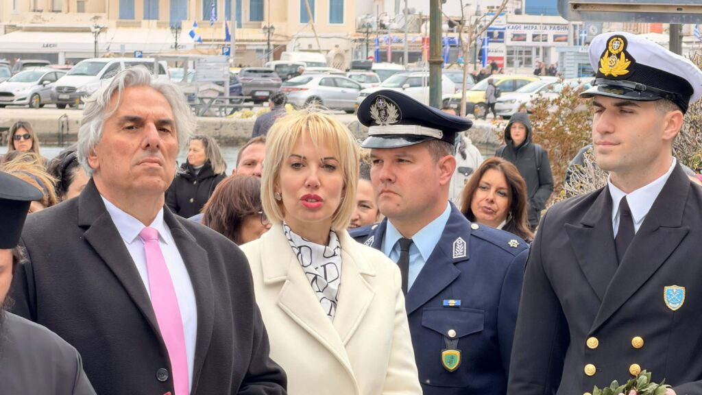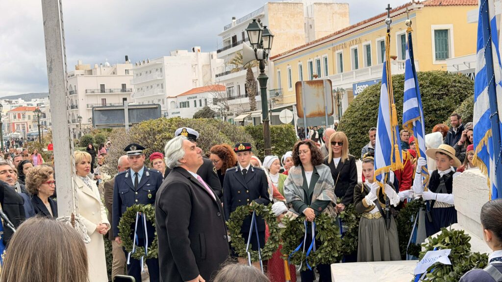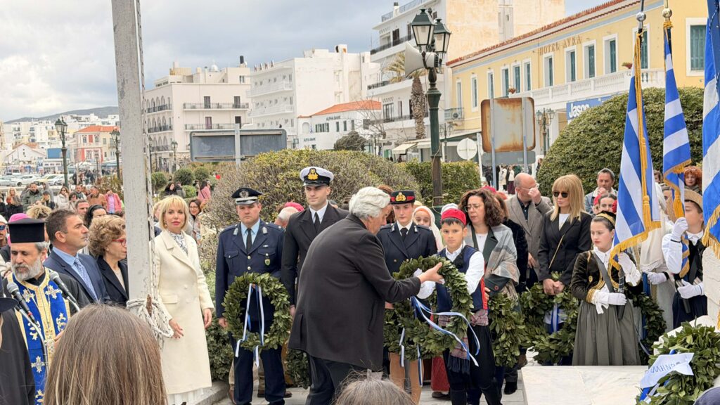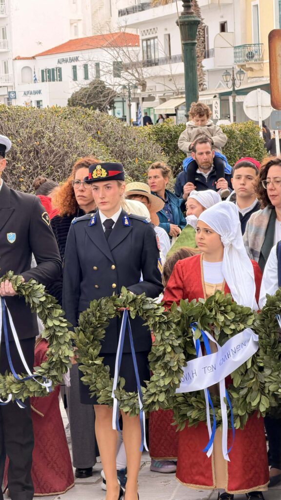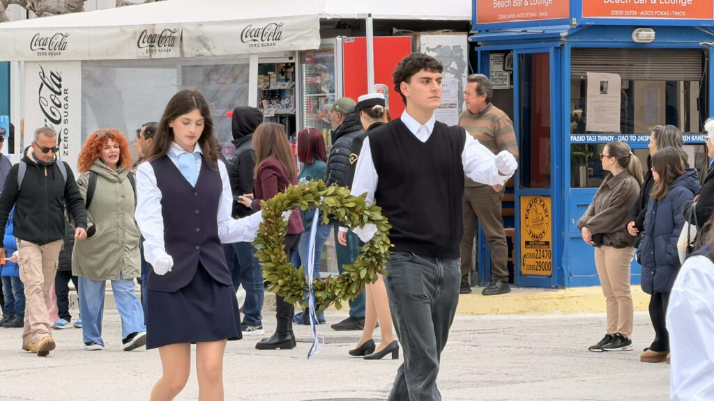 Οι μαθητές των σχολείων εν πομπή, προηγουμένης της Φιλαρμονικής του Π.Ι.Ι.Ε. Τήνου, έφτασαν στο Μνημείο Πεσόντων στην Πλατεία Ελευθερίας στην πόλη της Τήνου όπου πραγματοποιήθηκε Επιμνημόσυνη δέηση και κατάθεση στεφανιών.