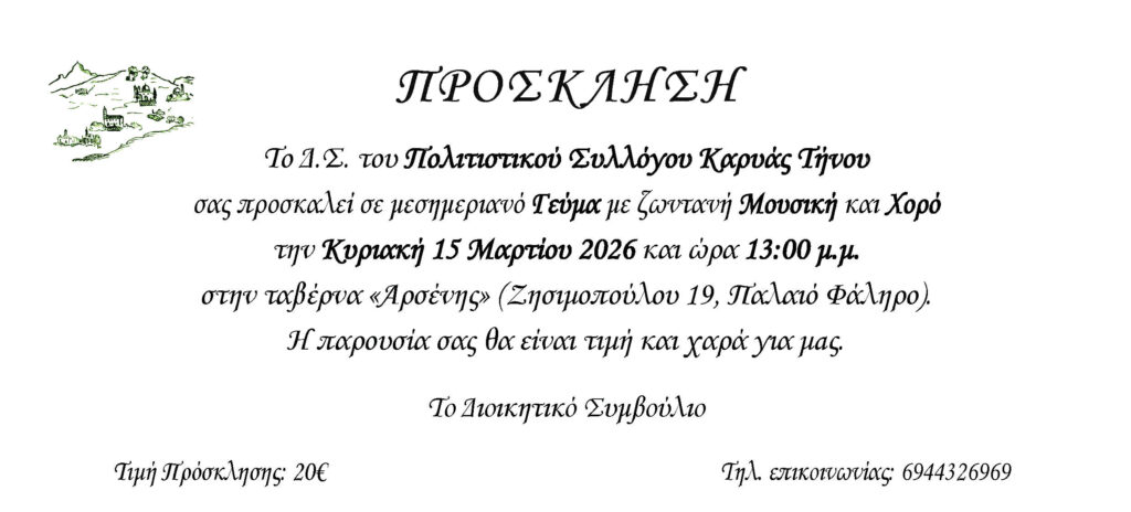 Το Δ.Σ. του Πολιτιστικού Συλλόγου Καρυάς Τήνου σας προσκαλεί σε μεσημεριανό Γεύμα με ζωντανή Μουσική και Χορό την Κυριακή 15 Μαρτίου 2026 και ώρα 13:00 μ.μ. στην ταβέρνα «Αρσένης» (Ζησιμοπούλου 19, Παλαιό Φάληρο).