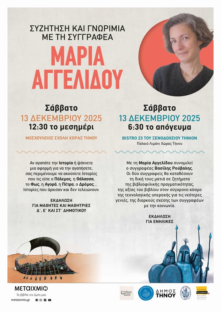 Στο εορταστικό κλίμα των ημερών, στην Τήνο έρχεται η συγγραφέας παιδικής και νεανικής λογοτεχνίας Μαρία Αγγελίδου. Καλεσμένη της Τηνίας Λέσχης Βιβλίου και της Εταιρείας Συγγραφέων, με την πολύτιμη αρωγή του Επαρχείου Τήνου και του Δήμου Τήνου. Γνώριμη από τα βιβλία της που συντροφεύουν τη νεότερη αναγνωστική γενιά, αλλά επίσης διακεκριμένη ως μεταφράστρια λογοτεχνίας ενηλίκων. Με σπουδές στην κλασική φιλολογία σε Αθήνα, Γερμανία και Ελβετία. Βραβευμένη επανειλημμένως για τον ποιοτικό πήχυ στη λογοτεχνική ενασχόλησή της. Στο δε πλούσιο βιογραφικό της υπάρχουν ιστορικά παραμύθια, μεταφράσεις κλασικών έργων διασκευασμένων για παιδιά, αλλά και μεταφράσεις σύγχρονων κλασικών.