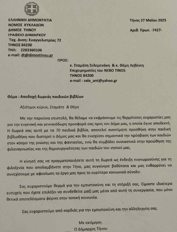 Η επιστολή του Δημάρχου Τήνου προς τους ιδιοκτήτες του ΝΕΒΟ, Σταμάτη και Θέμη