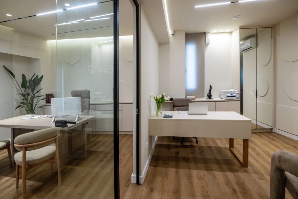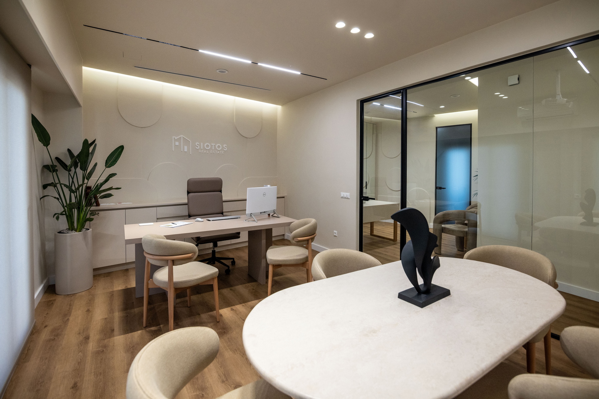 Ένα από τα πρόσφατα ολοκληρωμένα έργα της DtalesDesign στην Τήνο είναι ο σχεδιασμός του μεσιτικού γραφείου Siotos Real Estate. Ο σχεδιασμός κινήθηκε σε λιτούς, καθαρούς τόνους, με ισορροπημένη χρωματική παλέτα και απλές γραμμές, ώστε ο χώρος να παραμένει φωτεινός, λειτουργικός και ξεκάθαρος.