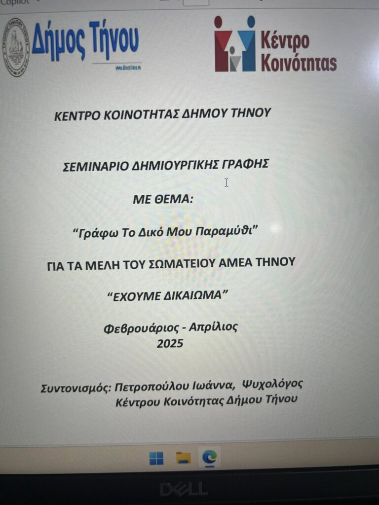 4. Διοργανώσαμε με το Τμήμα Τήνου του Διεθνούς Συμβουλίου Χορού (CID) τη δράση «Μια Τήνος για όλους», με θεματική την οπτική αναπηρία, με συνδιοργανωτές το Δήμο Τήνου, την Περιφέρεια Ν. Αιγαίου-Επαρχείο Τήνου και Επιμελητήριο Κυκλάδων.