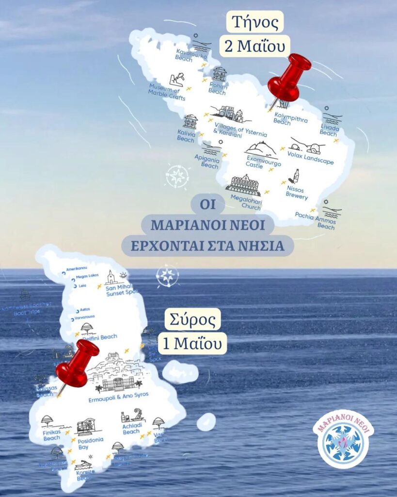 Οι Μαριανοί Νέοι Ελλάδας επισκέπτονται για δεύτερη φορά την Τήνο και τη Σύρο, εντός της σχολικής περιόδου, και προσκαλούν μαθητές Γυμνασίου και Λυκείου, καθώς και κάθε νέο, να συμμετάσχουν σε δύο ξεχωριστές απογευματο-βραδινές δράσεις (μία σε κάθε νησί), γεμάτες παιχνίδι και όμορφες εμπειρίες.