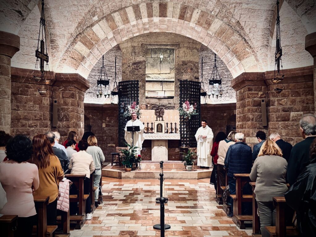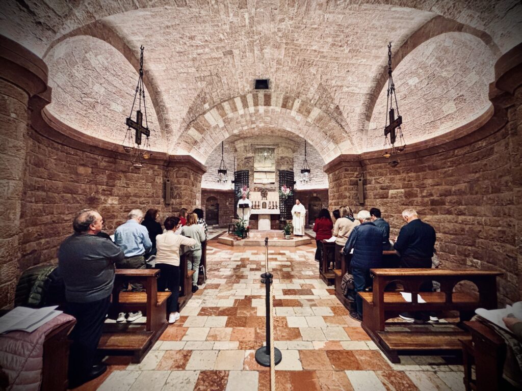 Πολύ νωρίς το πρωί είχαμε την μοναδική ευκαιρία να συμμετάσχουμε στην θεία Λειτουργία που τέλεσαν ο Αρχιεπίσκοπος π. Ιωσήφ και ο π. Γιάννης, στο απέριττο παρεκκλήσι της Κρύπτης του Αγίου Φραγκίσκου, όπου βρίσκεται και ο τάφος του εντός της κάτω βασιλικής.