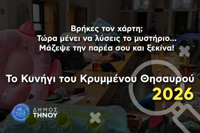 Ο Δήμος Τήνου προσκαλεί μικρούς και μεγάλους σε μια συναρπαστική περιπέτεια γεμάτη γρίφους, εκπλήξεις και… μυστήριο! Την Κυριακή 15 Φεβρουαρίου 2026, η Τήνος μεταμορφώνεται σε ένα τεράστιο παιχνίδι και εσείς είστε οι πρωταγωνιστές.