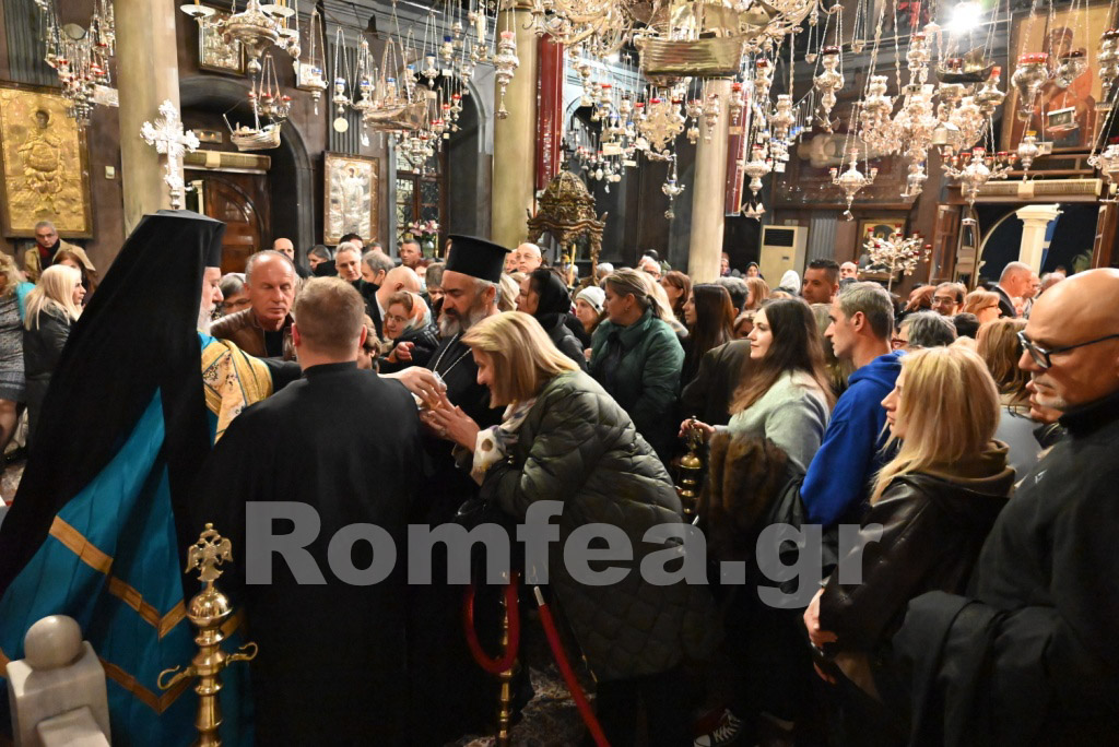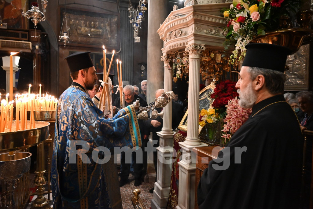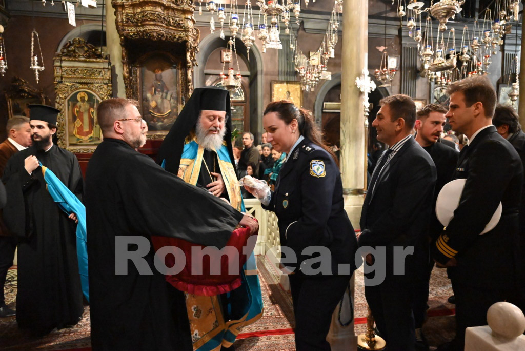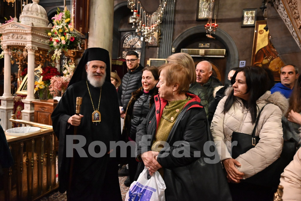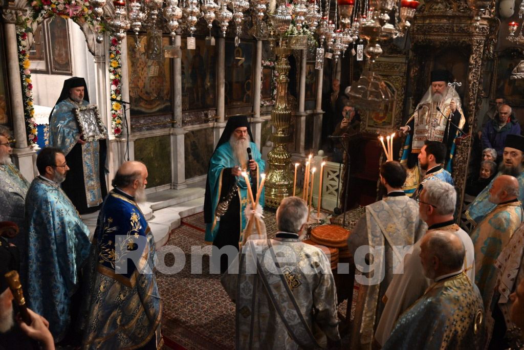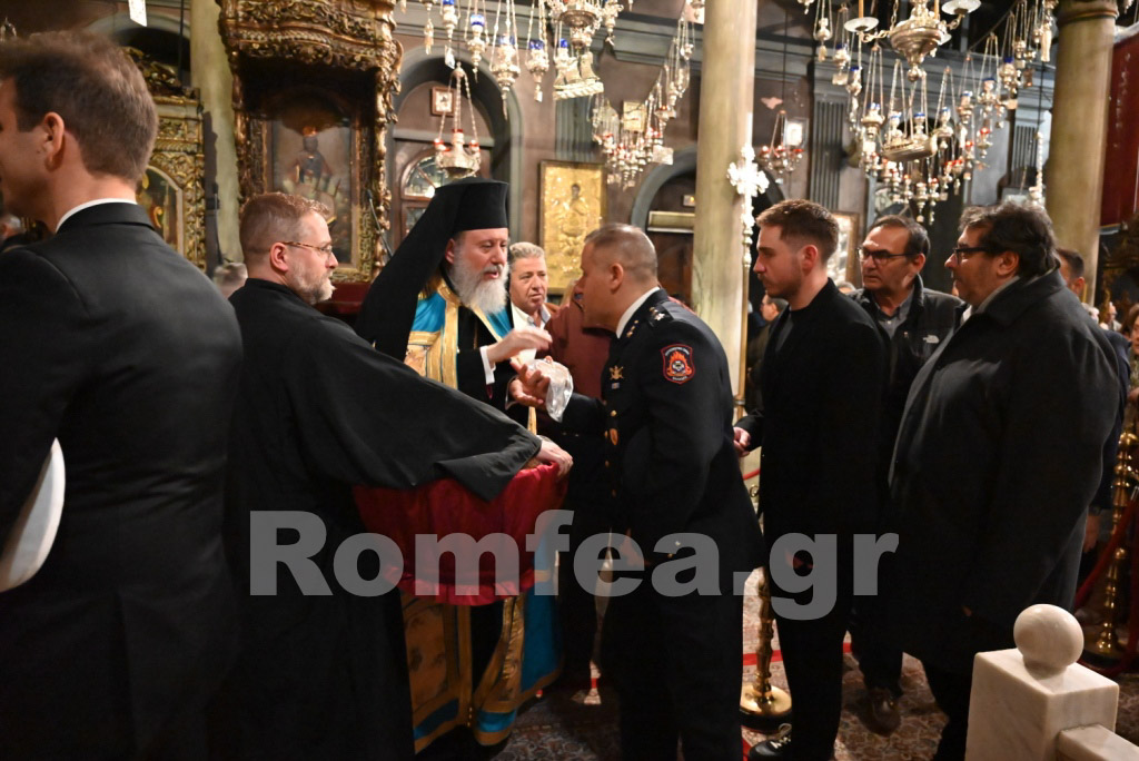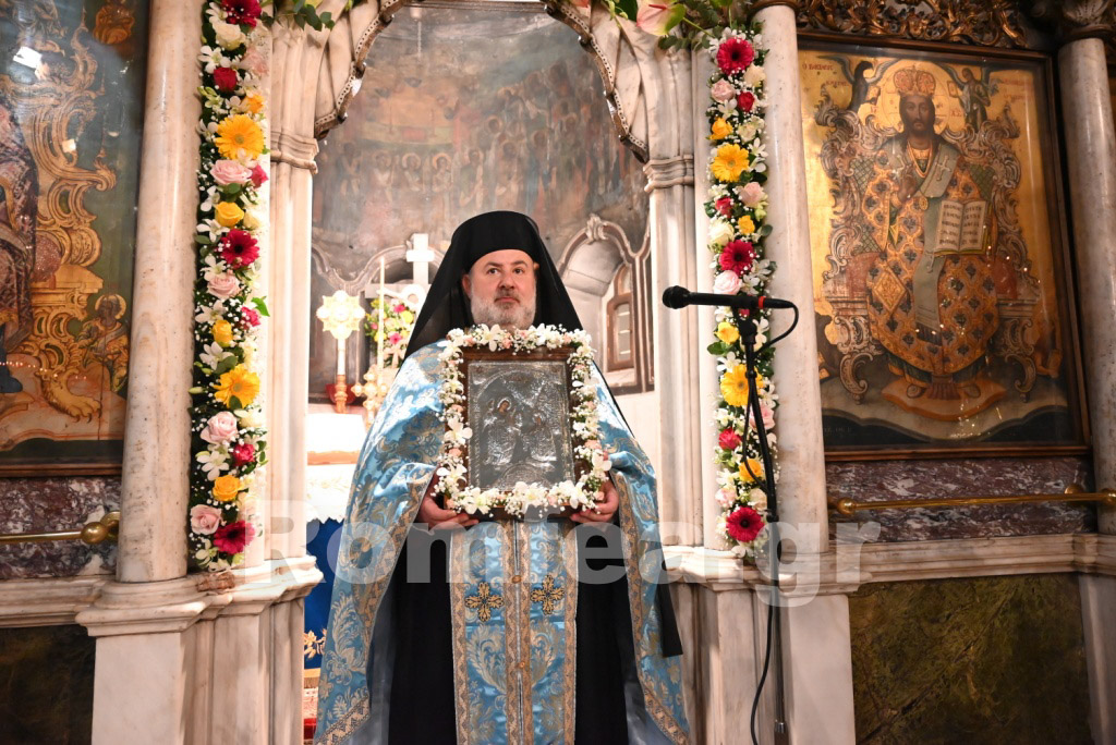 Τέλος, μετέφερε τις εόρτιες ευχές του Μακαριωτάτου Αρχιεπισκόπου Αθηνών και πάσης Ελλάδος κ. Ιερωνύμου προς τον Σεβασμιώτατο, τους Κληρικούς του νησιού, τις Αρχές, τα Σώματα Ασφαλείας και ευχήθηκε οι αποσκευές του κάθε προσκυνητή να είναι γεμάτες από χάρη Θεού και ελπίδα για τον σύγχρονο κόσμο.