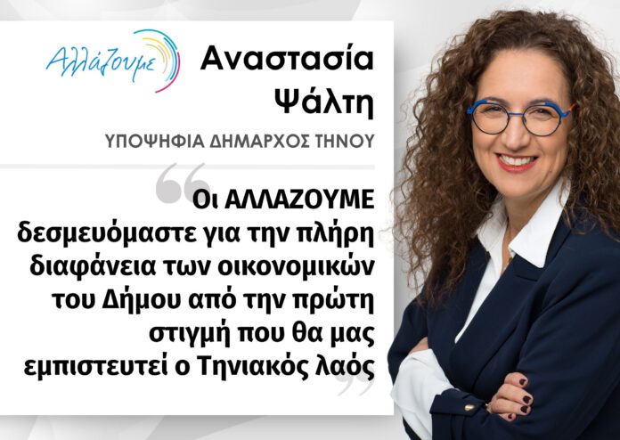 Οι ΑΛΛΑΖΟΥΜΕ θεωρούμε αυτονόητη υποχρέωση τη νόμιμη και έγκυρη ενημέρωση των δημοτών, ώστε να γνωρίζουν όλοι την πραγματική οικονομική κατάσταση του Δήμου μας και δεσμευόμαστε για την πλήρη διαφάνεια των ενεργειών μας από την πρώτη στιγμή που θα μας εμπιστευτεί ο Τηνιακός λαός