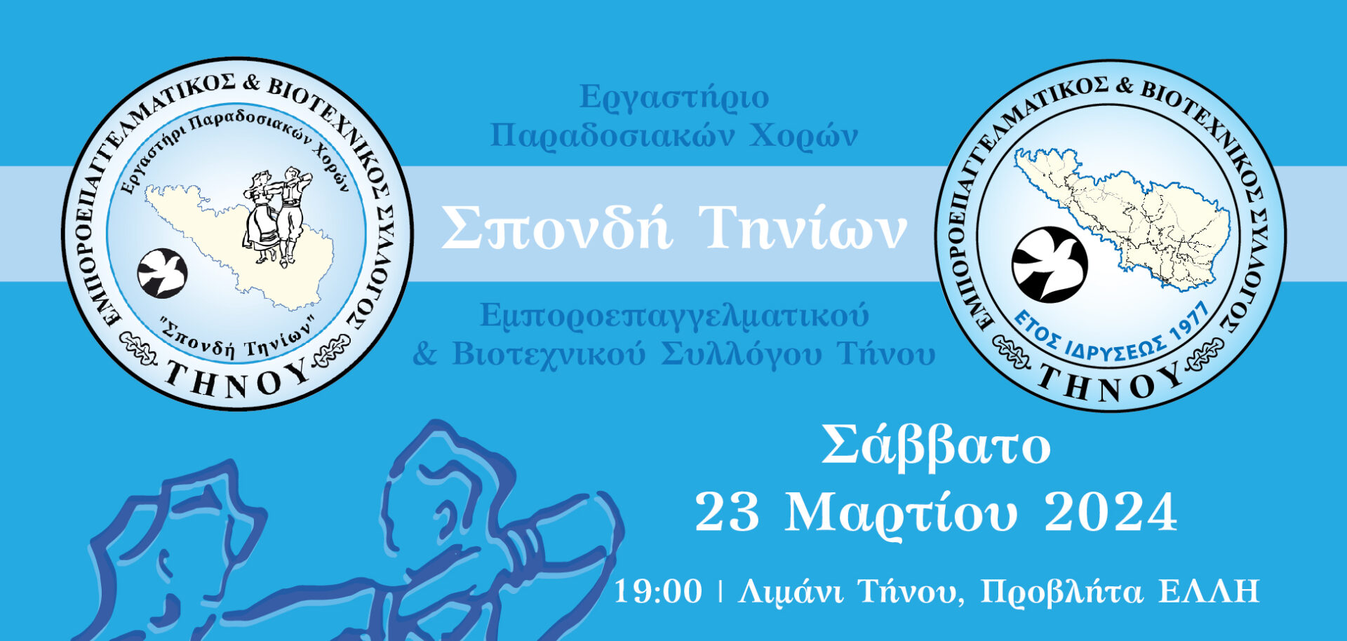Το εργαστήρι παραδοσιακών χορών «ΣΠΟΝΔΗ ΤΗΝΙΩΝ» του Εμποροεπαγγελματικού & Βιοτεχνικού Συλλόγου Τήνου, σας προσκαλεί στην παρουσίαση παραδοσιακών χορών το Σάββατο 23 Μαρτίου 2024, στις 19:00, στο εσωτερικό λιμάνι της Τήνου στον προβλήτα «ΕΛΛΗ».