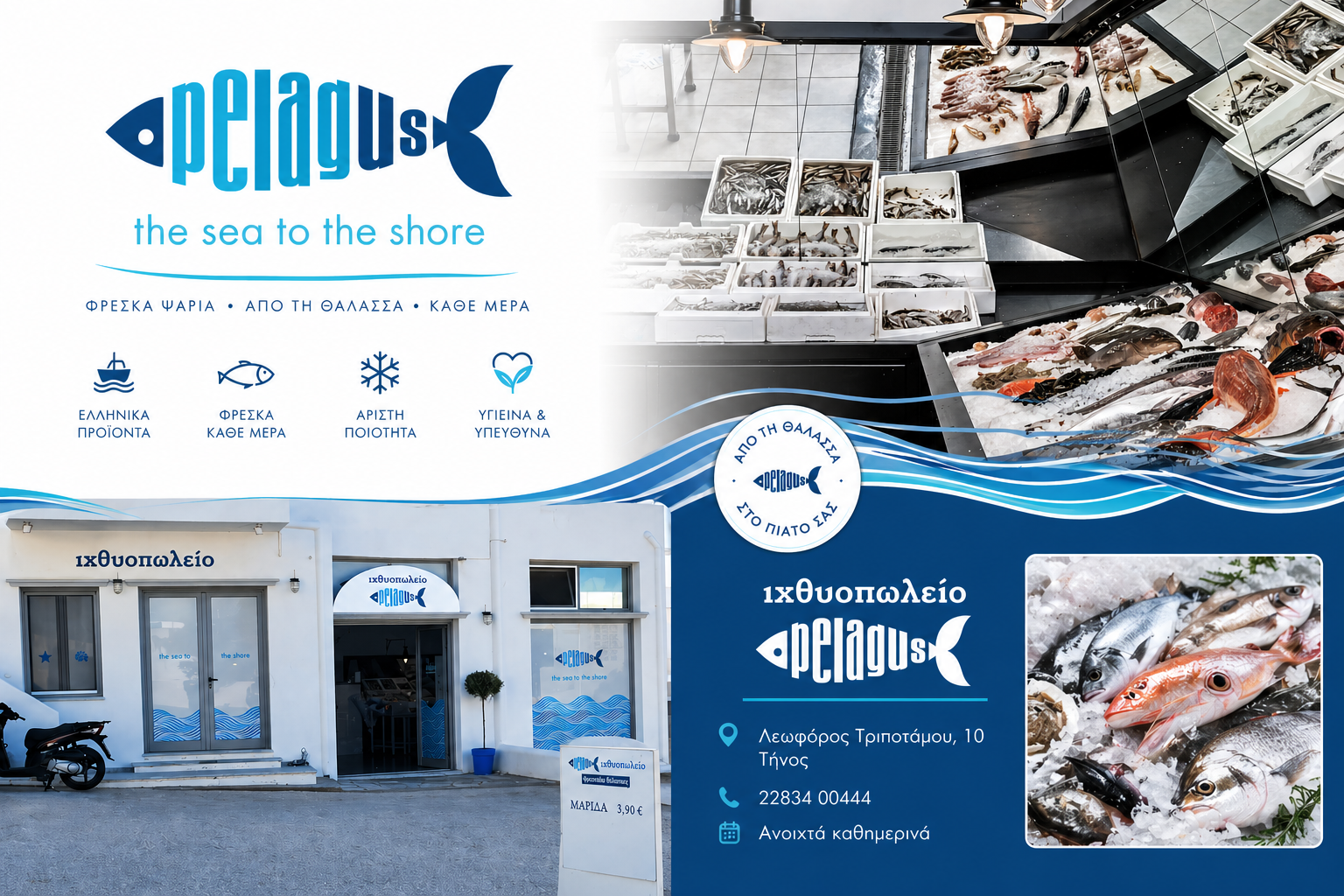 Το ιχθυοπωλείο «Pelagus» στην Τήνο είναι κοντά σας με φρέσκες επιλογές από χέρια των ειδικών. Στη συνέχεια μπορείτε να βρείτε τις προσφορές εβδομάδας που θα ισχύουν μέχρι εξαντλήσεως των αποθεμάτων.
