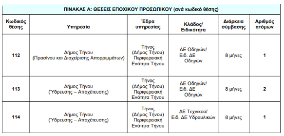 Ο Δήμος Τήνου θα προβεί στην πρόσληψη προσωπικού με σύμβαση εργασίας ιδιωτικού δικαίου ορισμένου χρόνου, συνολικά τεσσάρων (4) ατόμων, για την κάλυψη εποχικών ή παροδικών αναγκών ανταποδοτικού χαρακτήρα και συγκεκριμένα: