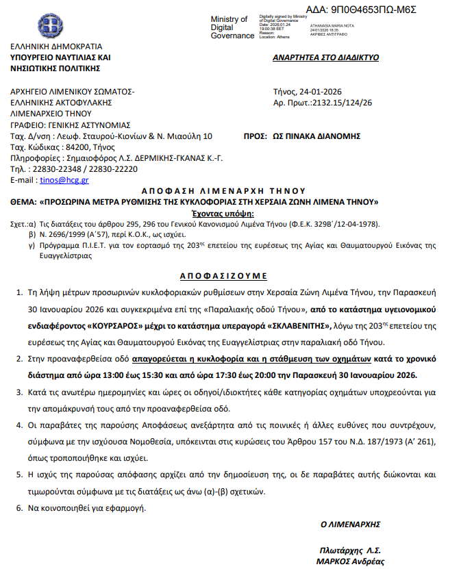 Σας γνωρίζουμε οτι, λόγω του Εορτασμού της 203ης επετείου της Ευρέσεως της Αγίας και Θαυματουργού Εικόνας της Ευαγγελίστριας, θα ισχύσουν την Παρασκευή 30η Ιανουαρίου 2026, και με απόφαση του Λιμενάρχη Τήνου, προσωρινά μέτρα ρύθμισης κυκλοφορίας στην χερσαία ζώνη του Λιμένα Τήνου.