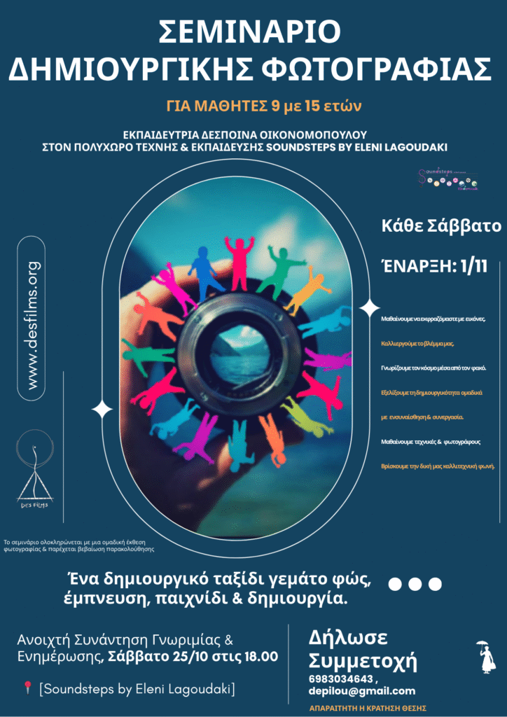 ΔΙΑΔΡΑΣΤΙΚΟ ΣΕΜΙΝΑΡΙΟ ΔΗΜΙΟΥΡΓΙΚΗΣ ΦΩΤΟΓΡΑΦΙΑΣ με την Δέσποινα Οικονομοπούλου στον Πολυχώρο Τέχνης & Εκπαίδευσης Soundsteps by Eleni Lagoudaki.