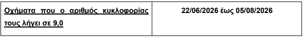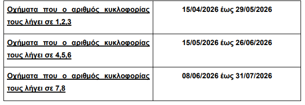 • Οχήματα που έχουν αλλάξει πινακίδες θα προσέλθουν για τεχνικό έλεγχο σύμφωνα με τον πρώτο αριθμό κυκλοφορίας.
