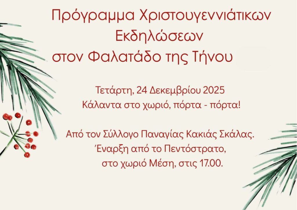Τετάρτη, 24 Δεκεμβρίου 2025, Κάλαντα στο χωριό του Φαλατάδου, πόρτα-πόρτα από τον Σύλλογο Παναγίας Κακιάς Σκάλας. Έναρξη από το Πεντόστρατο, στο χωριό Μέση στις 17.00