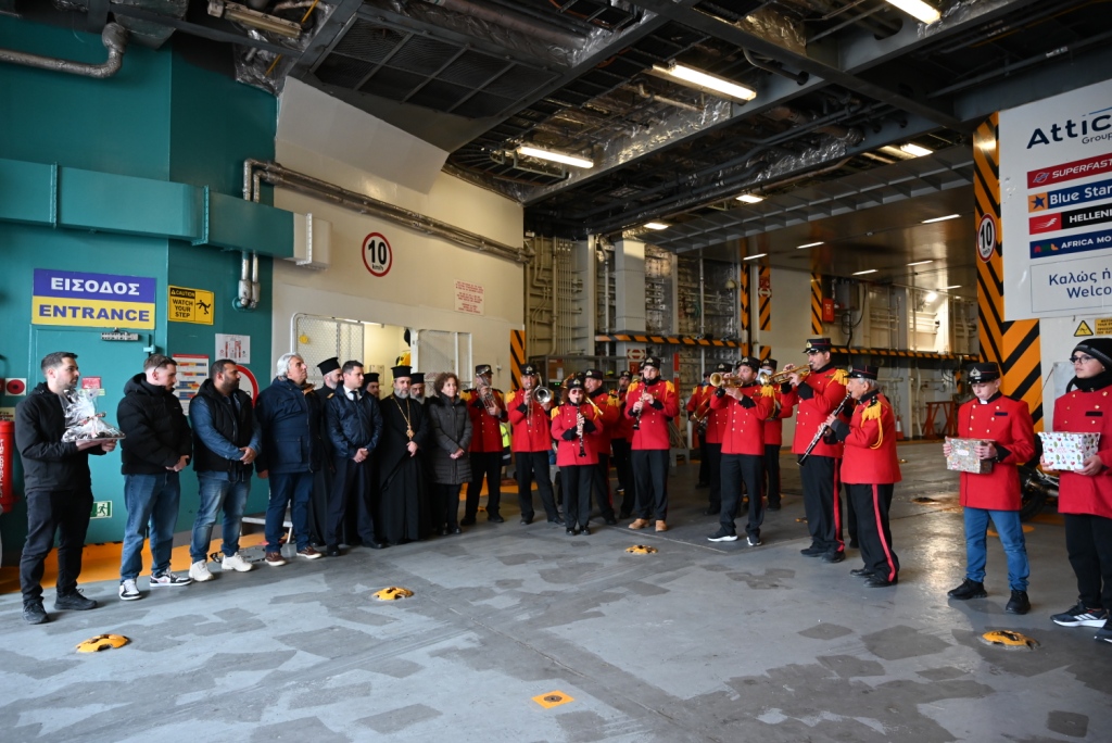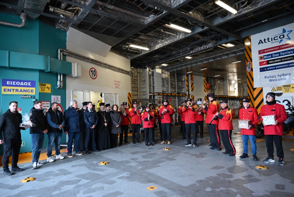 Αμέσως μετά η Φιλαρμονική του ΠΙΙΕΤ παρουσία του Αρχιερατικού Επιτρόπου, της Αντιπεριφερειάρχου Υγείας και Έπαρχου Τήνου, του Δημάρχου Τήνου και Δημοτικών Συμβούλων παιάνισε τα κάλαντα στην Αντιπεριφερειάρχη Υγείας και Έπαρχο Τήνου και ακολούθως μετέβησαν στα οχηματαγωγά πλοία “ΘΕΟΛΟΓΟΣ Π” της εταιρείας FAST FERRIES και “BLUE STAR PAROS” της εταιρείας BLUE STAR FERRIES, όπου παρουσία των Πλοιάρχων, των Αξιωματικών και των πληρωμάτων και των επιβατών παιάνισαν και εκεί τα τοπικά κάλαντα.