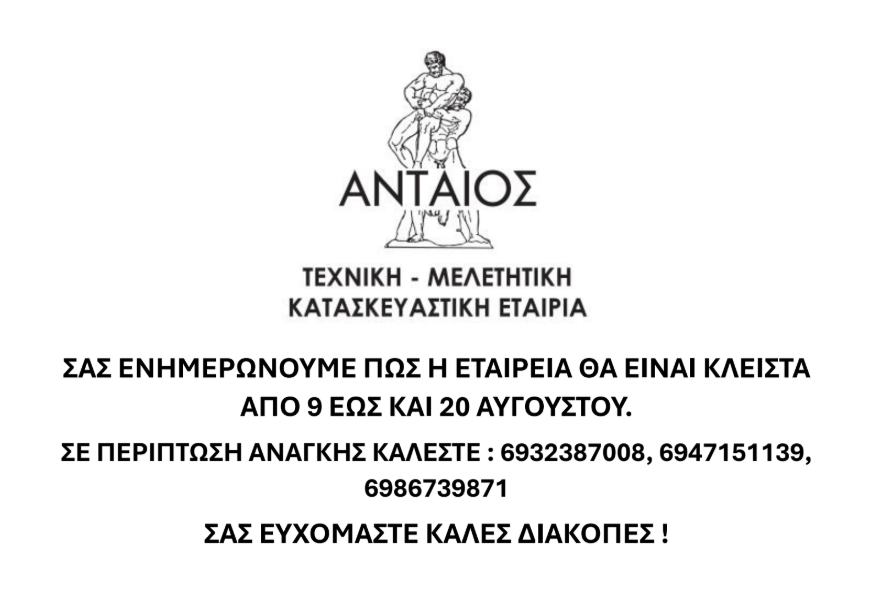Σας ενημερώνουμε πως η εταιρεία μας θα είναι κλειστά από 09 έως 20 Αυγούστου.