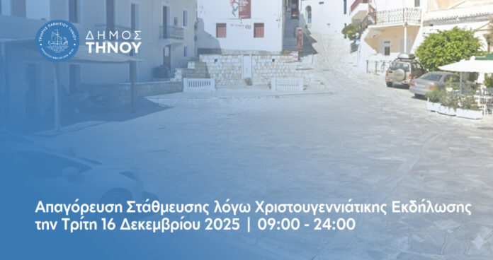 Ο Δήμος Τήνου ενημερώνει τους πολίτες ότι την Τρίτη 16 Δεκεμβρίου 2025 από αύριο το πρωί εώς το βράδυ απαγορεύεται η στάθμευση οχημάτων στην Πλατεία Κυπρίων Εθνομαρτύρων (απέναντι από την ταβέρνα «Άγκυρα»), λόγω τοποθέτησης φουσκωτού παιχνιδιού στο πλαίσιο προγραμματισμένης Χριστουγεννιάτικης εκδήλωσης.