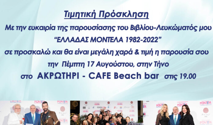 Η Καλοκαιρινή Παρουσίαση του Βιβλίου ΕΛΛΑΔΑΣ ΜΟΝΤΕΛΑ του Γιώργου Κουτούλια θα πραγματοποιηθεί στις 17 Αυγούστου στο ΑΚΡΩΤΗΡΙ Beach bar, στις 7 απόγευμα στον Αγ Φωκά στην ΤΗΝΟ.