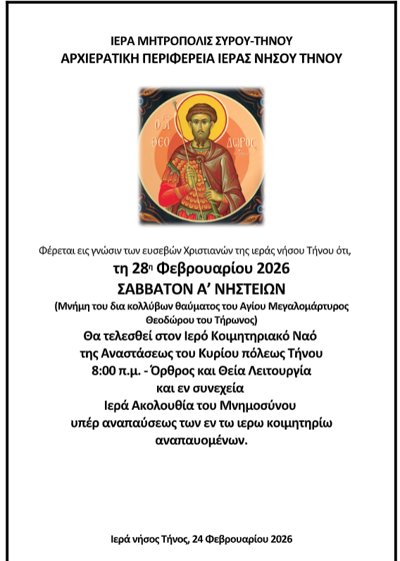 Φέρεται εις γνώσιν των ευσεβών Χριστιανών της ιεράς νήσου Τήνου ότι, τη 28 η Φεβρουαρίου 2026 ΣΑΒΒΑΤΟΝ Α’ ΝΗΣΤΕΙΩΝ (Μνήμη του δια κολλύβων θαύματος του Αγίου Μεγαλομάρτυρος Θεοδώρου του Τήρωνος)
