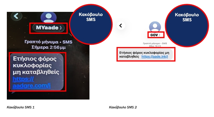 Τα μηνύματα αυτά, με την πρόφαση «μη καταβληθέντος ετήσιου φόρου κυκλοφορίας», ζητούν από τους παραλήπτες να πατήσουν σε σύνδεσμο (link) για να πληρώσουν δήθεν τέλη κυκλοφορίας οχημάτων.