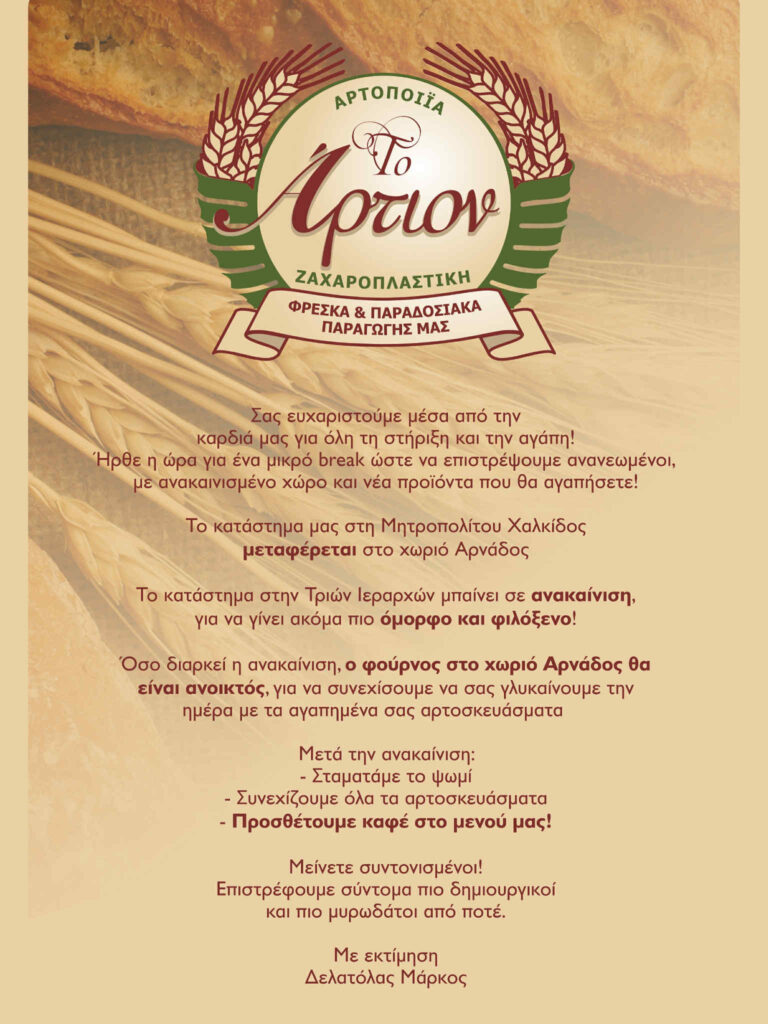 Το κατάστημά μας στη Μητροπόλεως Χαλκίδος μεταφέρεται στο χωριό Αρνάδος