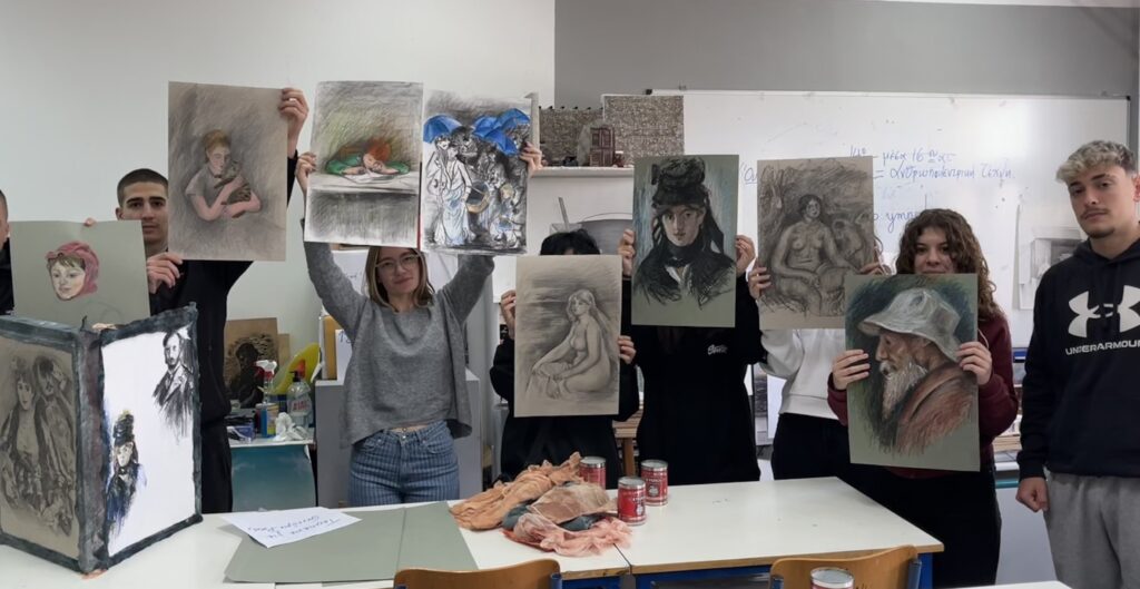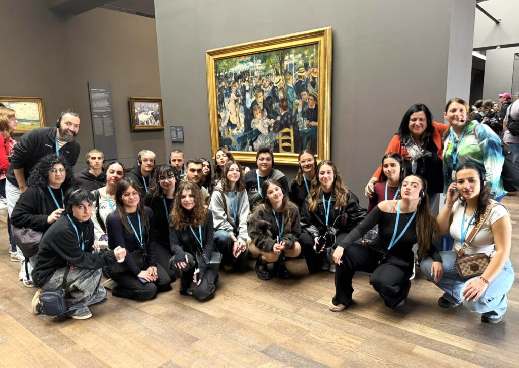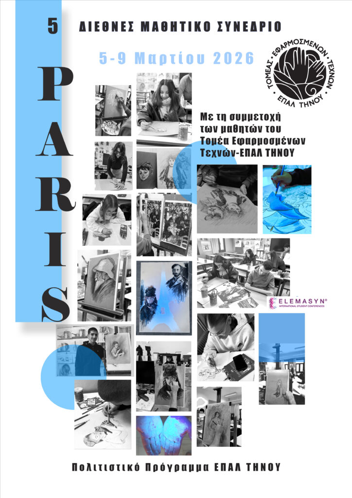 Η Β & Γ τάξη του Τομέα Εφαρμοσμένων Τεχνών του Επαγγελματικού Λυκείου Τήνου ταξίδεψε στο Παρίσι στο πλαίσιο της συμμετοχής του τομέα στο 5ο Διεθνές Μαθητικό Συνέδριο που πραγματοποιήθηκε στο κέντρο La Ferme du Buisson στο Noisiel 5 – 9 Μαρτίου 2026. Οι μαθητές/τριες του Επαγγελματικού Λυκείου Τήνου παρουσίασαν στον εκθεσιακό χώρο του συνεδρίου, την κατασκευή ενός χειροποίητου καλλιτεχνικού βιβλίου με ένα από τα θέματα που είχαν οριστεί από το συνέδριο: «Μίμηση έργου τέχνης – Δημιουργία μίας κατασκευής που αναδεικνύει τη διαφορετική ματιά στον Ιμπρεσιονισμό, βάσει των κοινωνικών ρόλων των φύλων – Αναφορά στην Μπερτ Μοριζό και στον Πιερ-Ογκίστ Ρενουάρ». Οι μαθητές επαναπροσδιόρισαν εικαστικά έργα τους με διάφορες τεχνικές. Χρησιμοποίησαν ακρυλικά, λάδια, ξηροπαστέλ, κάρβουνα, ξυλομπογιές, χαρακτική-ξυλογραφίες, φωτογραφία, video και Νέα Μέσα.
