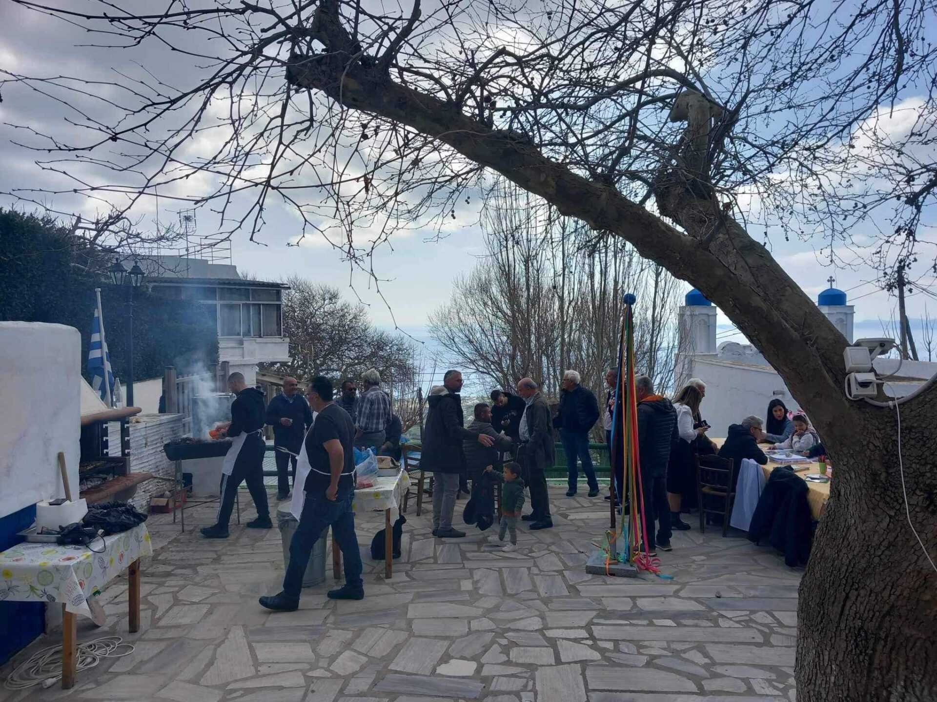 Συγχωριανοί, φίλοι του χωριού αλλά και Τηνιακοί από τα γειτονικά χωριά μαζεύτηκαν όλοι μαζί για να γιορτάσουν και να τσικνίσουν. Ψήσιμο στην αυλή της αίθουσας, κέφι και χορός συνόδευσαν αυτή την όμορφη ημέρα. Φυσικά δεν έλειψαν και οι μασκαρεμένοι!