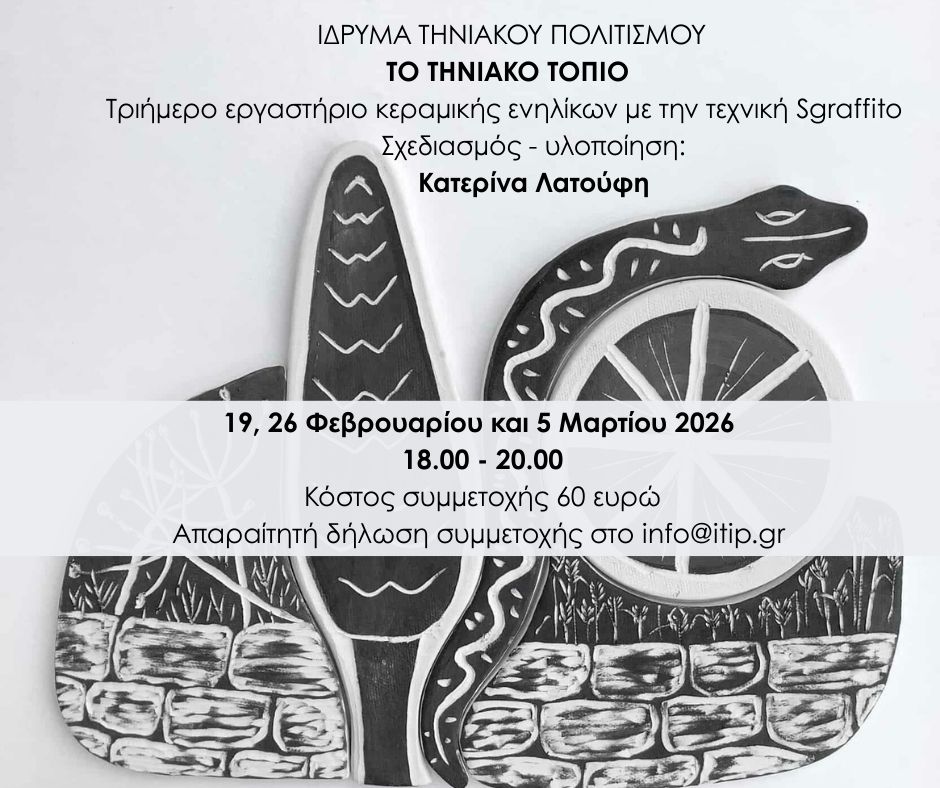 Το Ίδρυμα Τηνιακού Πολιτισμού διοργανώνει τριήμερο εργαστήριο κεραμικής ενηλίκων με τίτλο «Το Τηνιακό Τοπίο», με εισηγήτρια την κεραμίστρια Κατερίνα Λατούφη.