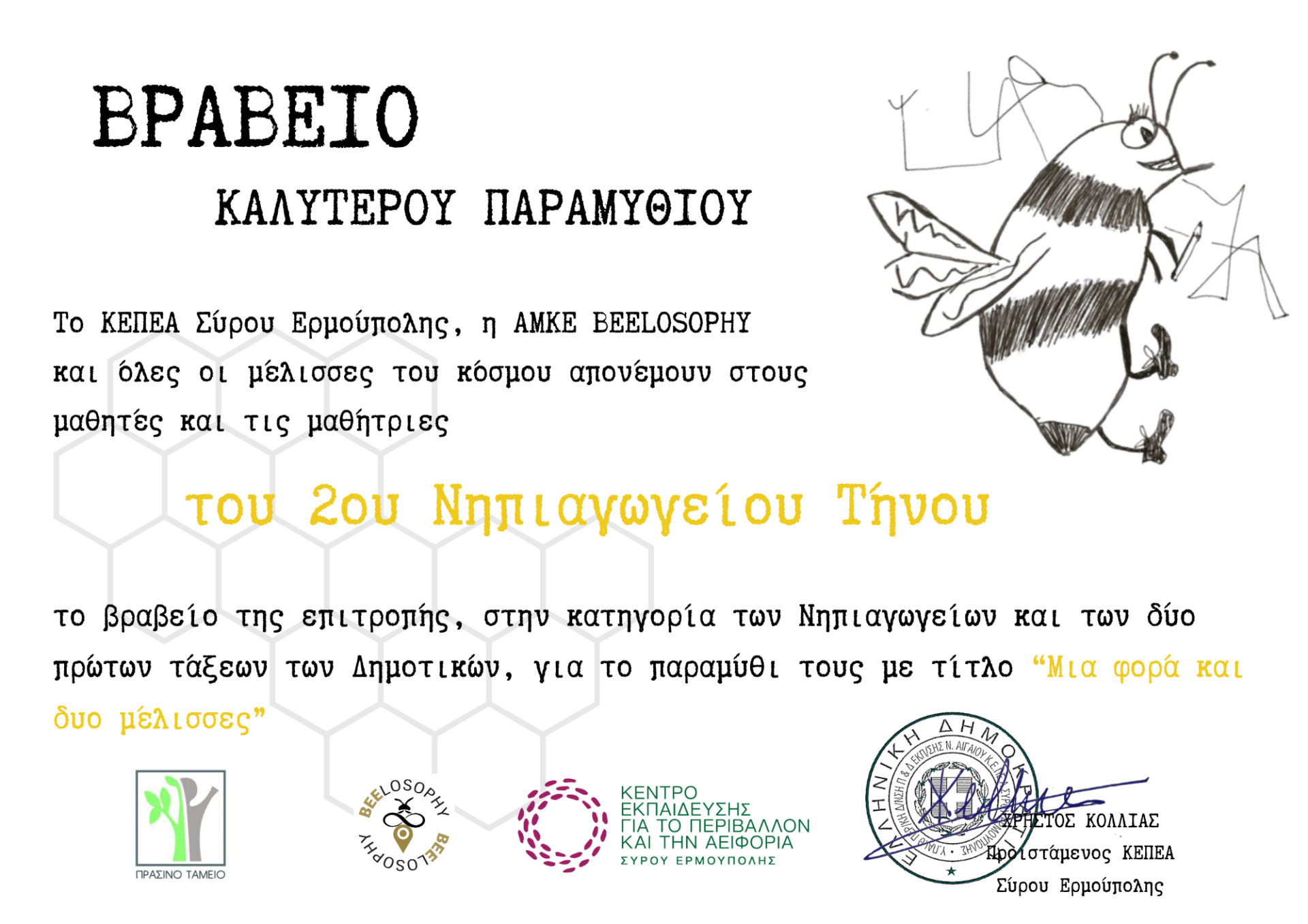«Το να είσαι νηπιάκι είναι μαγικό! Δεν είσαι απλά ένας μικρός μαθητής ή μια μικρή μαθήτρια. Είσαι ζωγράφος, χτίστης, μάγειρας, επιστήμονας… Αυτή τη φορά γίναμε συγγραφείς και εικονογράφοι. Το παραμύθι μας «Μια φορά και δυο μέλισσες» βραβεύτηκε ως το καλύτερο στην κατηγορία του, στον μαθητικό διαγωνισμό «Μια φορά και μια μέλισσα» που διοργανώθηκε από το ΚΕΠΕΑ Σύρου. Μπορείτε να διαβάσετε το παραμύθι στο pdf που επισυνάπτεται.