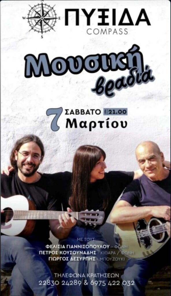 Μουσική βραδιά θα πραγματοποιηθεί το Σάββατο 07 Μαρτίου, στις 21:00, στον χώρο της Πυξίδας.